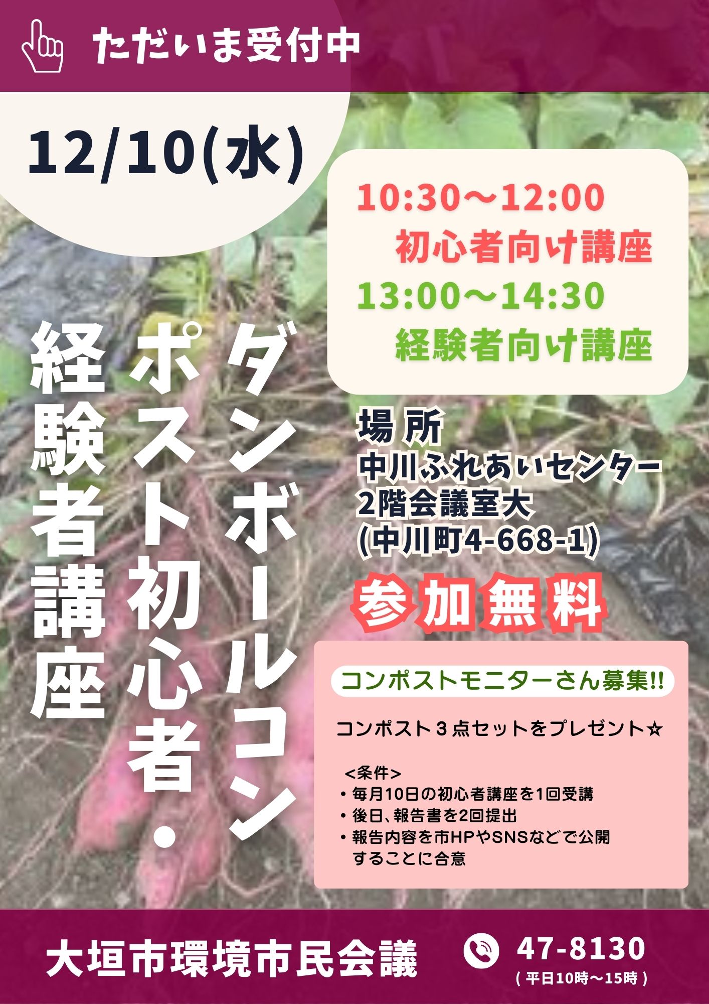 12/10(水)ダンボールコンポスト初心者・経験者講座のお知らせ