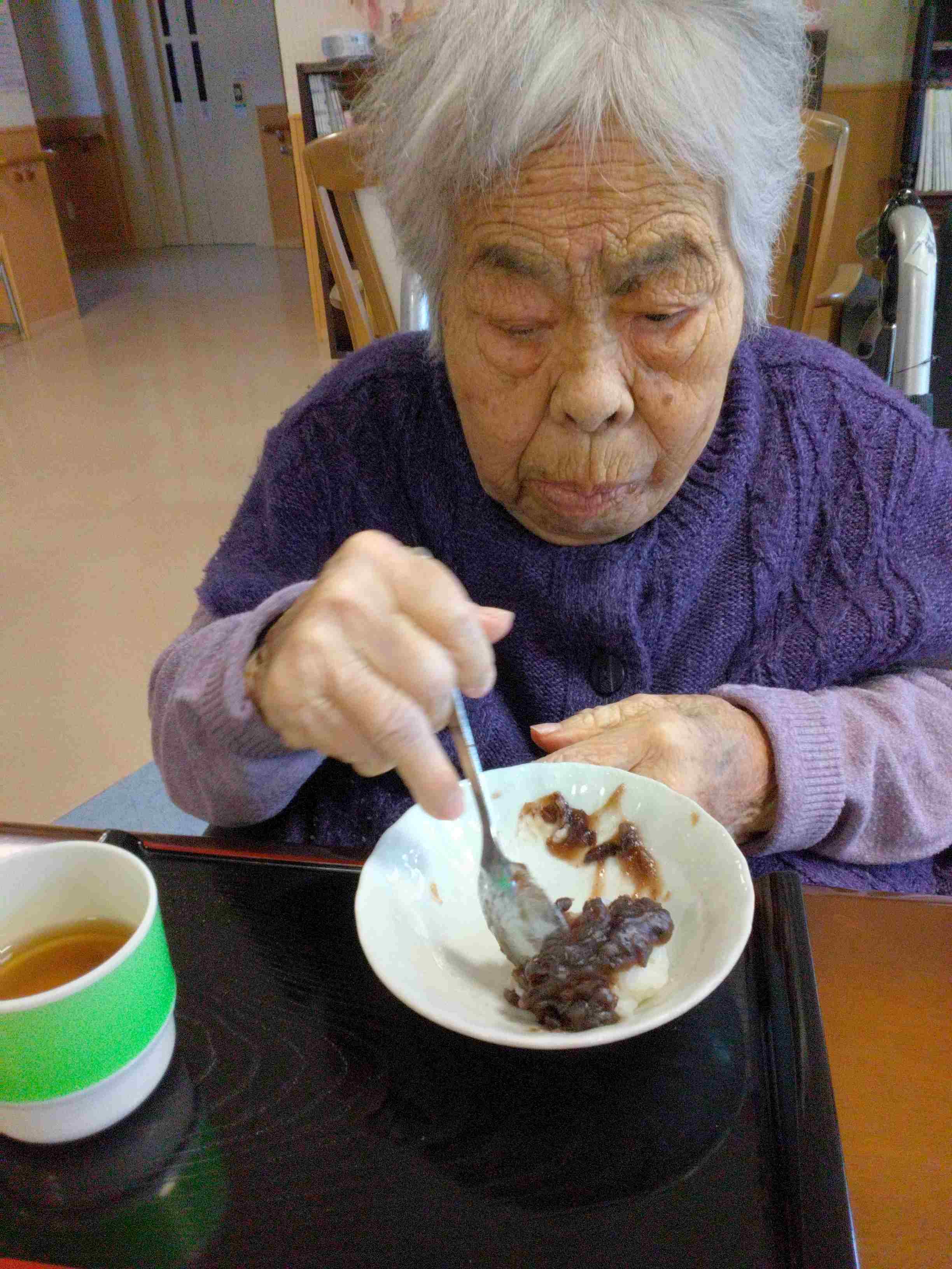 お花見をしながら、本日のおやつは「あんこもち」です。