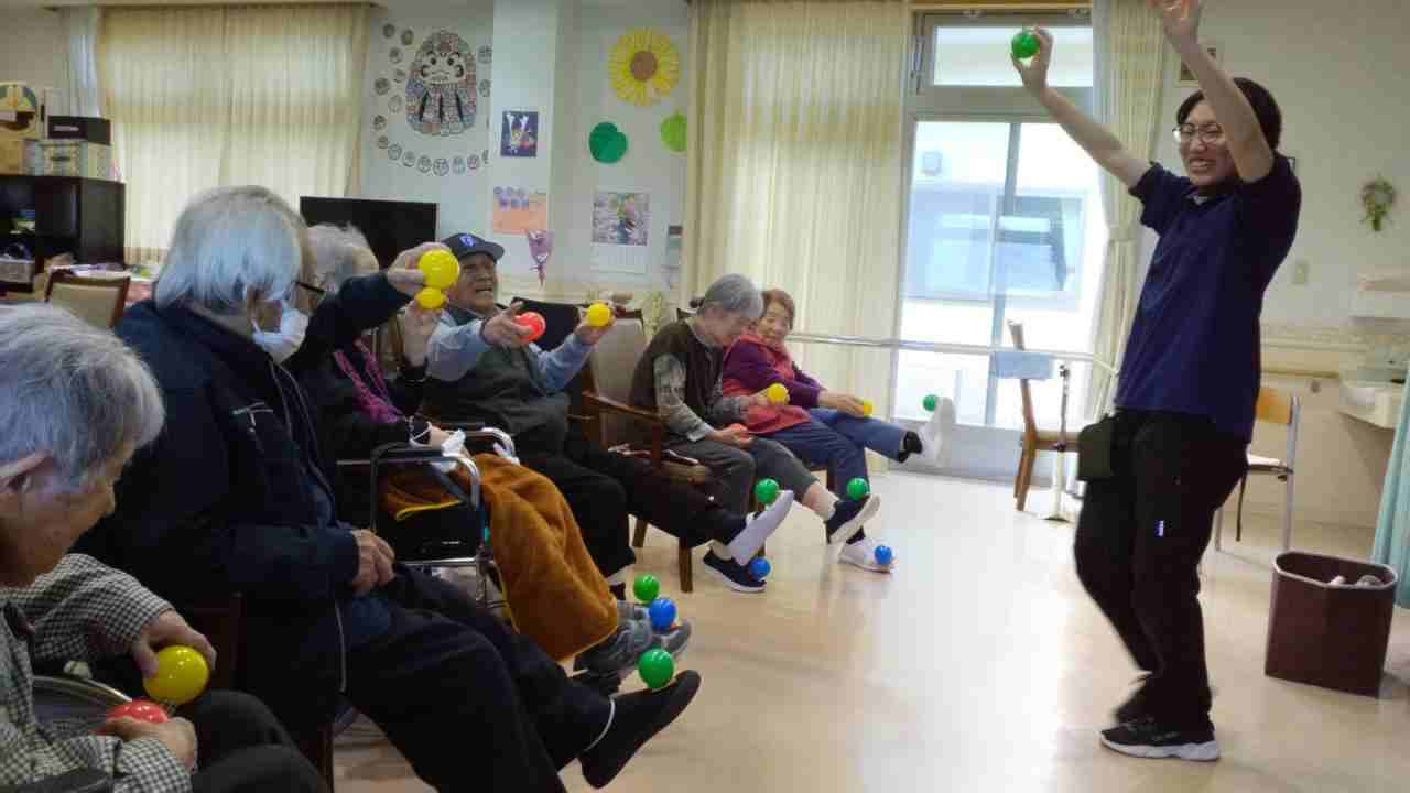スタッフが言う色の付いている手や足を挙げるというシンプルな脳トレ