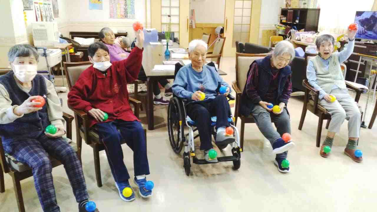 今日のレクはカラーボールを両手両足に付け、足踏みスタート。