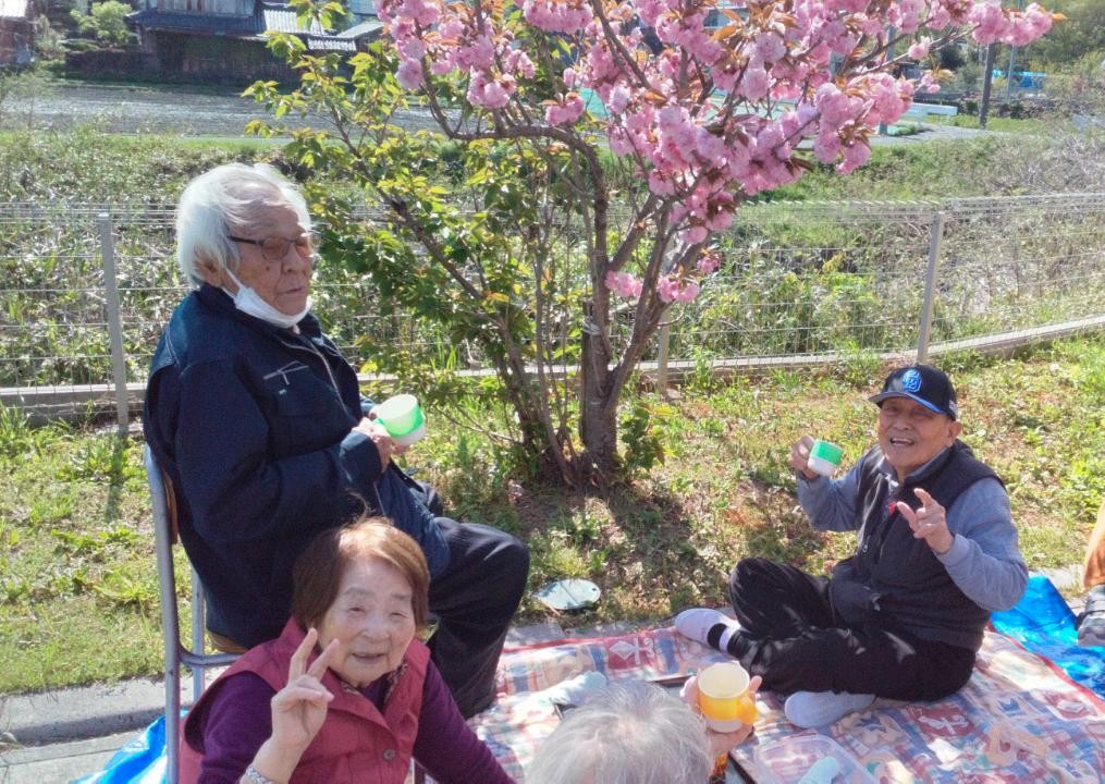レクの後は、満開の八重桜の下でお花見をしながらおやつを食べました。