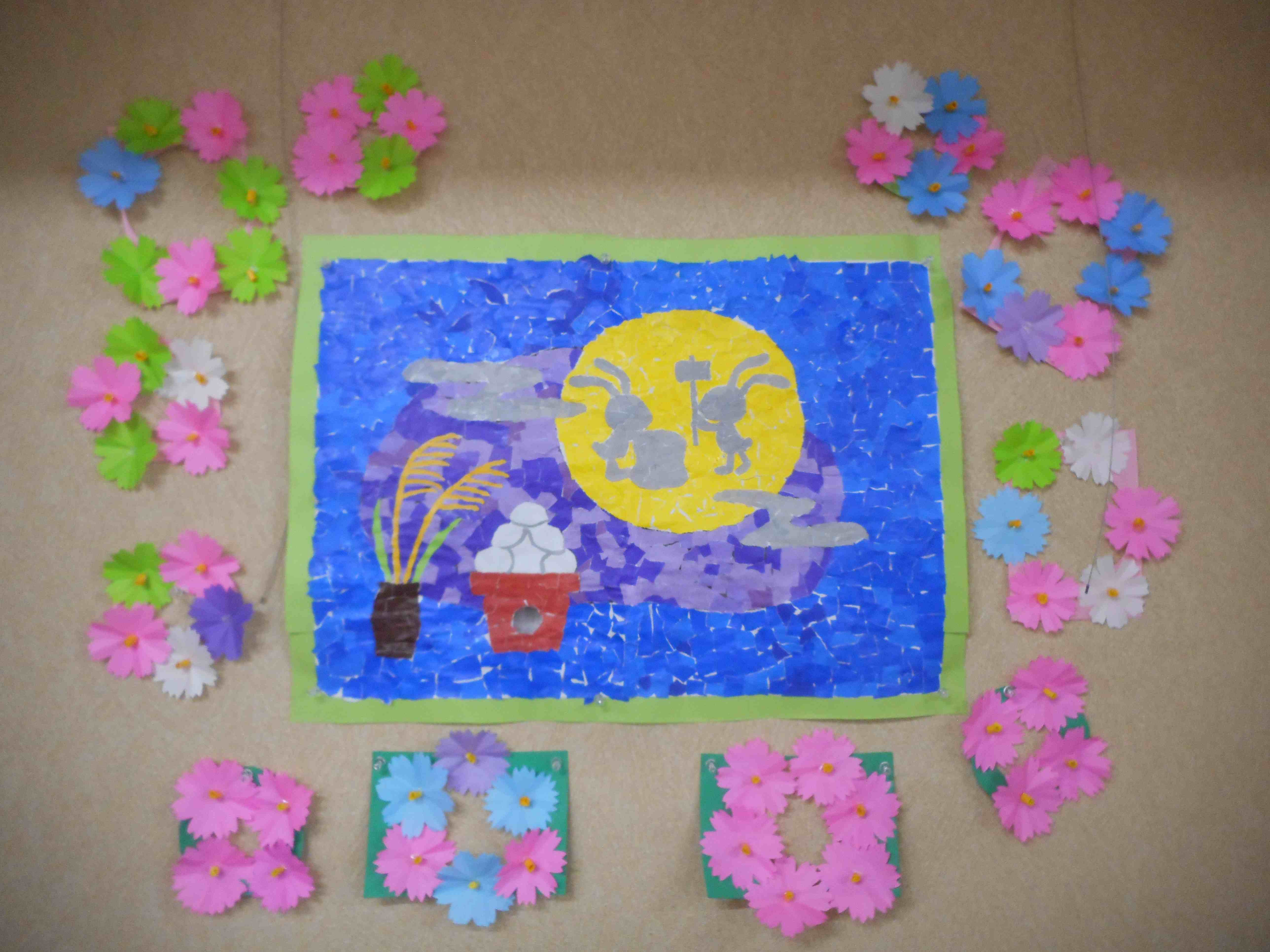 10月に入り過ごしやすくなりました。 田んぼの稲刈りも始まり、秋の深まりを感じます。 9月の作品は「お月見」でした。 貼り絵グループとコスモスリースグループに分かれて 壁面画をつくりました。 貼り絵が完成すると、コスモスリースも作りたいと要望があり、希望された方は コスモスリースを作られてお持ち帰りされました。