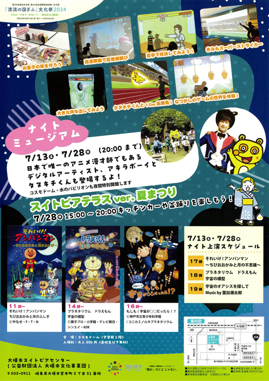 ◆サマーナイトミュージアム 開館時間を20時まで延長します。 いつもより落ち着いた、夜のスイトピアセンターをお楽しみください。 日本で唯一のアニメ漫才師でもあるデジタルアーティスト、アキラボーイとタヌキチくんも登場するよ! ※コスモドーム・水のパビリオンも夜間特別開館します。 開催日:7月13日(土)・7月28日(日) 20時00分まで ◆ナイト上映 開催日:7月13日(土)・7月28日(日) コスモドーム(学習館1階) 入場料:300円(高校生以下無料) ◆スイトピアテラスver.夏まつり 遊んで、学べるエリアがいっぱい! 開催日:7月28日(日) 15時00分〜20時00分まで 詳細は、ホームページをご確認ください。 https://www2.og-bunka.or.jp/bunka/news/data_3236.html https://www2.og-bunka.or.jp/bunka/news/data_3160.html |