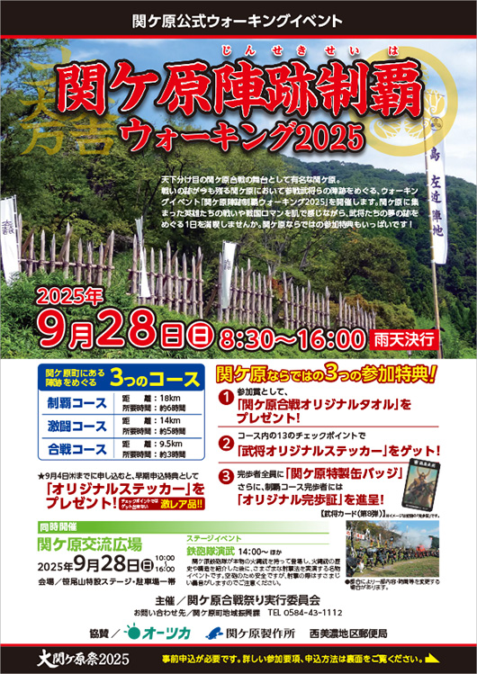 当日参加できます! 8:30から関ケ原町役場前駐車場にて申込受付します。 天下分け目の関ケ原合戦の舞台として有名な関ケ原。戦いの跡が今も残る関ケ原において参戦武将らの陣跡をめぐる、ウォーキングイベント「関ケ原陣跡制覇ウォーキング2025」を開催します。 関ケ原に集まった英雄たちの戦いや戦国ロマンを肌で感じながら、武将たちの夢の跡をめぐる1日を満喫しませんか。 関ケ原ならではの参加特典もいっぱいです! 【参加特典】 1.参加賞として、「関ケ原合戦オリジナルタオル」をプレゼント! 2.コース内の13のチェックポイントで「武将オリジナルステッカー」をゲット! 3.完歩者全員に「関ケ原特製缶バッジ」さらに、制覇コース完歩者には「オリジナル完歩証【武将カード(第8弾)】」を進呈! 4.9月4日(木)までに申し込むと、早期申込特典として「オリジナルステッカー」をプレゼント!チェックポイントではゲット出来ない激レア品!! 日にち/2025年9月28日(日) 各コース受付時間/8:30〜 受付場所/関ケ原町役場前駐車場 参加資格/心身ともに健康な方 ※小学生以下は保護者同伴 参加費/1,000円(傷害保険料、参加費等を含む) 持ち物/参加証、帽子、雨具、飲み物、健康保険資格確認書等 ※昼食は各自ご準備ください。なお、ゴール地点では飲食関連の出店もありますのでご利用ください。 ※一部山歩き等もありますので、歩きやすい服装と靴でご参加ください。 ---------------------------------------------- ※詳しくは、ホームページでご確認ください。 https://www.sekigahara1600.com/event/20240719101312.html ---------------------------------------------- |