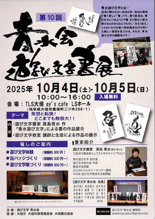 テーマ:発想と転換!どこまでも無限大!! ・遊び文字書家 高島青水 作 「青水遊び文字」による書の作品展示 ・遊び文字教室 講師と生徒による作品の展示 〜催しのご案内〜 ・遊び文字体験(体験料 300円) ・缶バッジづくり(体験料 300円〜) ・遊び文字凧づくり(体験料 800円〜) ---------------------------------------------- ※詳しくは、ホームページでご確認ください。 https://kagayaki.nisimino.com/docs/2025091900013/ ---------------------------------------------- |