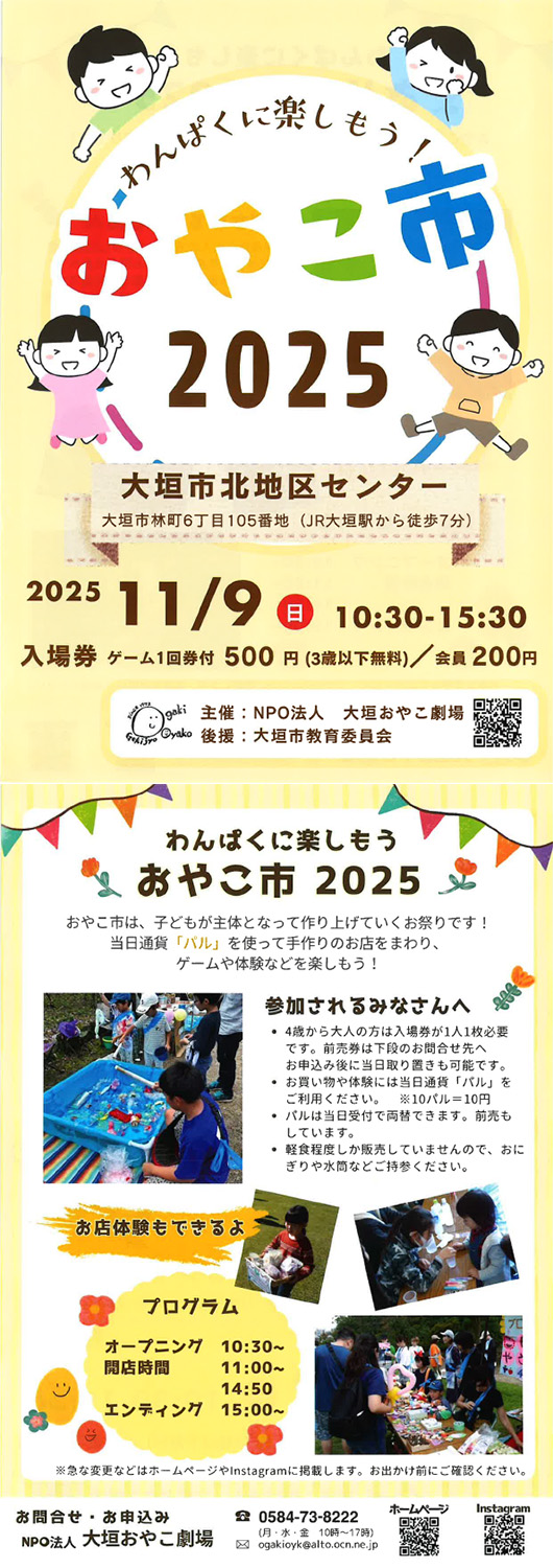 おやこ市は、子ども達が主体となって作り上げていくお祭りです! 当日通貨「パル」を使って手作りのお店を回り、 ゲームや体験などを楽しもう! とき/10:30〜15:30 入場券(ゲーム1回券付)/一般 500円・会員 200円 ※3歳以下無料 =========================== ≪プログラム≫ 10:30 オープニング 11:00 開店 14:50 閉店 15:00 エンディング =========================== |