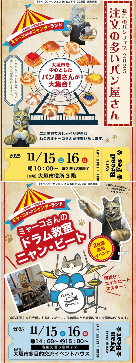ニャンか楽しそうなこと、ぜ〜んぶ詰め込んじゃったニャ!パン食べて、リズム叩いて、いっぱい笑ってほしいニャ!あ、写真も撮っていいから、かわいく撮ってニャ〜! (1)ねこのパンフェス2025 注文の多いパン屋さん 大垣を中心としたパン屋さんのパンが大集合します。猫モチーフの限定パンも登場し、パン好き必見・猫好き歓喜の企画です。ミャ〜コさんが食べたいと太鼓判を押したパンが並びます。可愛くて美味しいパンがあなたのお腹も心も幸せにしてくれます。 ●時間/10:00〜 売切れ次第終了 ●場所/大垣市役所3階 ●出店予定/10店舗 (2)ドラム教室「ニャン・ビート」 ミャ〜コさん直伝のリズムレッスンです。ねこなのに…ドラムが叩ける!?と話題のミャ〜コさんが、子どもも大人も楽しめる簡単なリズムワークショップを開催いたします。「ニャン♪ニャン♪ビートでハッピー!」を合言葉に、音楽初心者大歓迎の企画。 ●時間/(1)14:00〜 (2)15:00〜 ●場所/大垣市多目的交流イベントハウス ●所要時間/約30分/回 ●定員/各回5名(当日予約) ---------------------------------------------- ※詳しくは、ホームページでご確認ください。 https://www.instagram.com/p/DOxJnx6AboY/ ---------------------------------------------- |