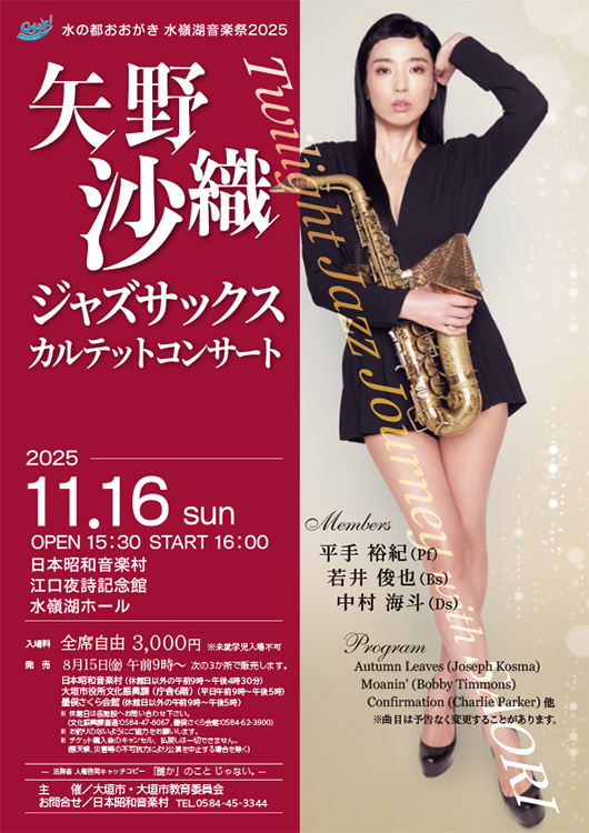 【出演】 矢野沙織(サックス) 平手裕紀(ピアノ/日本昭和音楽村アンバサダー) 若井俊也(ベース) 中村海斗(ドラムス) 【プログラム】 Autumn Leaves(Joseph Kosma) Moanin(Bobby Timmons) Confirmation(Charlie Parker) 他 ※曲目は予告なく変更することがあります 【入場料】 全席自由 3,000円(※未就学児入場不可) ---------------------------------------------- ※詳しくは、ホームページでご確認ください。 https://www.city.ogaki.lg.jp/ongaku/0000037143.html#20251116 ---------------------------------------------- |