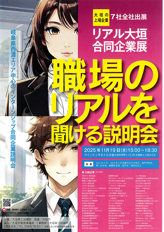 【岐阜県西濃エリア中心のインターンシップ合同企業説明会】 職場のリアルを聞ける説明会 「リアル大垣合同企業展」は、地元の学生の就職活動を応援したい!と願う企業が集まる企業展です。 地元だから、学生の皆さんも企業も「安心」と「信頼」という土台の上からスタートできます。 参加企業全てが、あなたの人生を左右する就職活動の成功にお役に立ちたいと願っています。 ぜひ、この企業展が良い人生との出会いの場となりますように。 ◆全出展企業64社 ◆大垣上場企業7社 ◆西濃エリア優良企業 ◆入場無料 ※服装自由 <参加対象> 2027年3月、2026年3月卒業予定の大学生、専門学校生 第二新卒者、転職希望者、留学生、高校生 等 <内容> ◆ブース出展事業所数:64社 企業ごとに面談ブースを設置し、元気企業の経営者・人事担当者などが企業の魅力をPRします。 ◆職業相談コーナー:岐阜県中小企業総合人材確保センター、ハローワーク大垣 迷ったら、まずココ!企業の探し方や就職活動等についてアドバイスします。 ---------------------------------------------- ※詳しくは、ホームページでご確認ください。 https://www.real-ogaki.com/ ---------------------------------------------- |