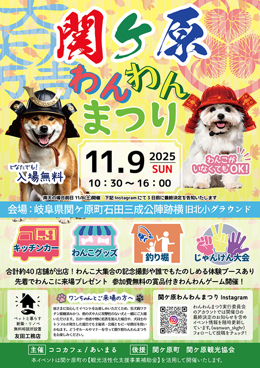 合計40店舗が出店! わんこ大集合の記念撮影や誰でも楽しめる体験ブースあり。 先着でわんこに来場プレゼント! 参加費無料の商品付きわんわんゲーム開催! 開催日/2025年11月9日(日) 10:30〜16:00 ※雨天の場合、前日の11月8日(土)に開催 ※Instagramにて3日前に最終決定を告知いたします ---------------------------------------------- ※詳しくは、ホームページでご確認ください。 https://www.sekigahara1600.com/event/20251011104833.html ---------------------------------------------- |