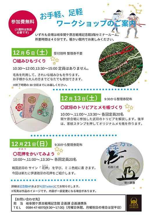 「お手軽、足軽ワークショップ」は、どなたでも手軽に参加できる、身近な材料を使ったワークショップです。 所要時間はいずれも40分程度です。参加費は無料です(入館料は別途必要) 。 子どもから大人までどなたでも参加できます。 今回は、3つの人気ワークショップを下記のとおり開催します。 ◆組みひもづくり 日にち/12月6日(土) 時間/10:30〜12:00、13:30〜15:00 定員/なし 整理券/不要、随時受付 毛糸を利用して、きれいな組みひもを作ります。 ※各回終了時間の30分前までに会場にお越しください。 ◆武将のトリビアとメモ帳づくり 日にち/12月13日(土) 時間/10:00〜、11:00〜、13:30〜 定員/各回20名 整理券/9:30から配布 関ケ原合戦に参加した武将のトリビアを解説します。 後半は、家紋スタンプを押してオリジナルメモ帳を作ります。 ◆花押(かおう)をかいてみよう 日にち/12月21日(日) 時間/10:00〜、11:00〜、13:30〜 定員/各回20名 整理券/9:30から配布 戦国武将のサイン「花押(かおう)」を学び、ミニ色紙に書きます。 今回は新たに伊達政宗の花押をご紹介します。 ---------------------------------------------- ※詳しくはホームページでご確認ください。 https://sekigahara.pref.gifu.lg.jp/event/%e8%a8%98%e5%bf%b5%e9%a4%a8%e3%82%a4%e3%83%99%e3%83%b3%e3%83%88/p7978/ ---------------------------------------------- |
