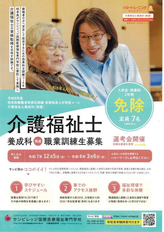 ◆国家資格取得 ◆入学金・授業料 免除 ライフステージに合わせた働き方が選べる。 この訓練は、岐阜県が離職者の方が安定的に就労するために効果的な訓練コースをサンビレッジ国際医療福祉専門学校に委託して実施し、介護福祉士の資格取得を目指すものです。 ---------------------------------------------- ※お申込みなど、詳しくはホームページでご確認ください。 https://syokugyokunren.sunvi-college.jp/ ---------------------------------------------- |