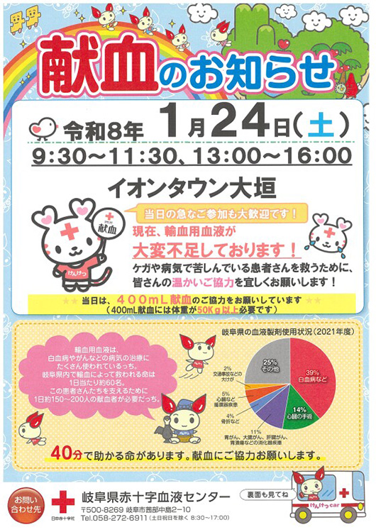 現在、輸血用血液が大変不足しております! ケガや病気で苦しんでいる患者さんを救うために、皆様の温かいご協力をお願いします! ---------------------------------------------- ※詳しくは、ホームページでご確認ください。 https://www.aeontown.co.jp/ogaki/event/detail/?id=015699 ---------------------------------------------- |