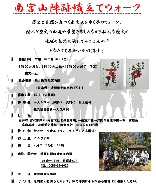 歴史と自然が息づく南宮山を歩く冬のウォーク。 澄んだ空気の山道や展望を楽しみながら壮大な歴史と地域の物語に触れてみませんか? どなたでも参加いただけます!お土産のミニタオル付き! 【行程】 垂井町 宮代案内所(南宮大社北側駐車場)→南宮大社→安国寺恵瓊陣跡→第 1 休憩所→高山神社→毛利秀元陣跡→南宮大社 ※約3.5キロ行程 ※急斜面の登山もあります。体力体調に不安がある場合はご遠慮ください。 【募集人数】 15人(先着順) 【参加費】 一人500円(保険代・資料代・お土産付)、観光協会会員一人300円 ---------------------------------------------- ※お申込みなど、詳しくはホームページでご確認ください。 https://www.tarui-kanko.jp/docs/2026012100017/ ---------------------------------------------- |