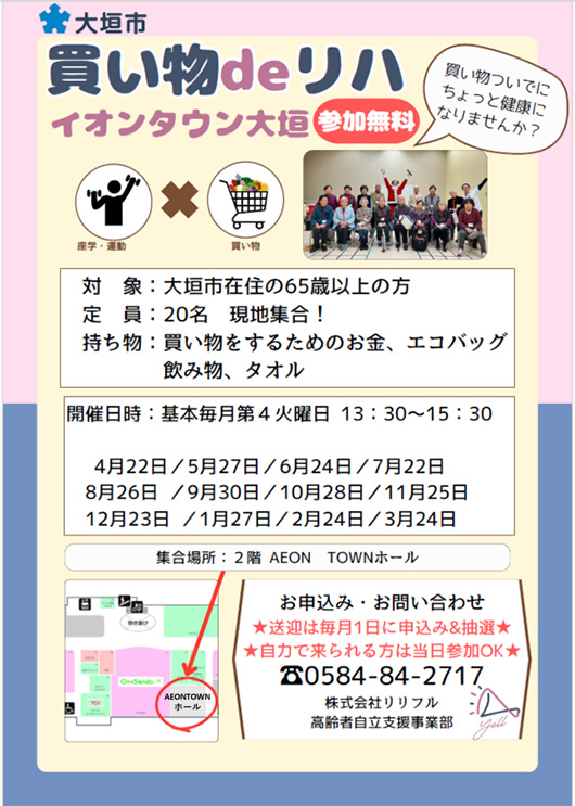 買い物ついでにちょっと健康になりませんか? リハビリの専門家による体操の後はイオンタウンでお買物♪ 皆で一緒に楽しく運動+お買物までできちゃいます。 ご希望の方には送迎の対応もございます。(毎月1日に申込み&抽選) ぜひお気軽にお問合せください。 ※大垣市の『令和7年度 大垣市一般高齢者介護予防事業』の取り組みです。 ---------------------------------------------- ※お申込みなど、詳しくはホームページでご確認ください。 https://www.aeontown.co.jp/ogaki/event/detail/?id=011821 ---------------------------------------------- |