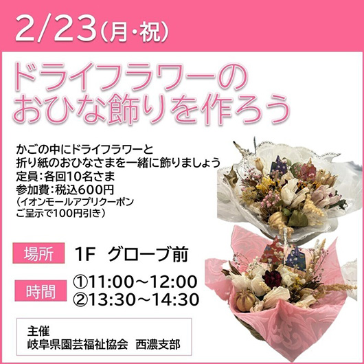 かごの中にドライフラワーと折り紙のおひなさまを一緒に飾りましょう。 参加費:お一人さま600円(税込) ※イオンモールアプリクーポンご呈示で100円引き 定員:各回先着10名さま 主催:岐阜県園芸福祉協会西濃支部 ---------------------------------------------- ※詳しくは、ホームページでご確認ください。 https://www.aeon.jp/sc/ogaki/event/event_e73693_as.html ---------------------------------------------- |