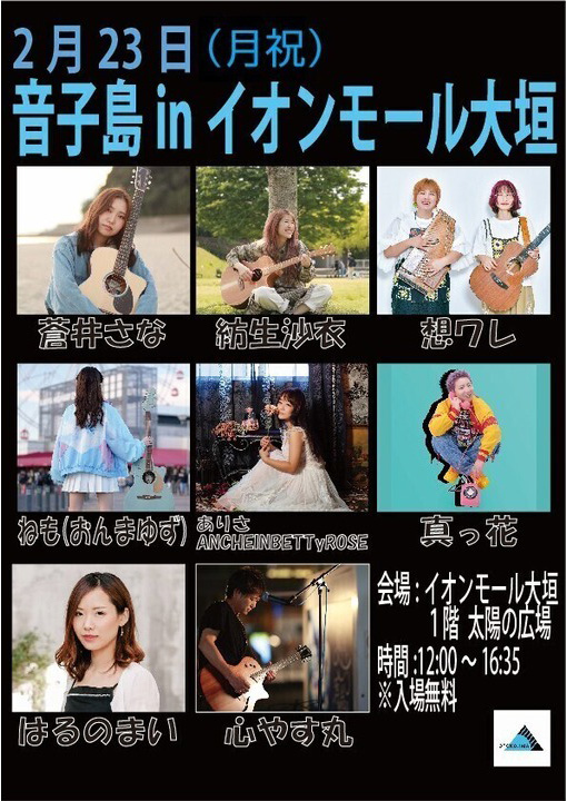 全国で活動中の弾き語りアーティストが集合! ■2月23日(月・祝)タイムテーブル 12:00〜12:20 紡生沙衣 12:25〜12:50 想ワレ 12:55〜13:15 ねも(おんまゆず) 13:20〜13:45 心やす丸 13:50〜14:15 真っ花 14:20〜14:40 紡生沙衣 14:45〜15:10 蒼井さな 15:15〜15:40 はるのまい 15:45〜16:10 ありさANCHEINBETTyROSE 16:15〜16:35 ねも(おんまゆず) ※出演者の変更・出演の順番変更に関しましては、音子島のX(旧twitter)にてお知らせいたします。 https://twitter.com/otokojima_ ---------------------------------------------- ※詳しくは、ホームページでご確認ください。 https://www.aeon.jp/sc/ogaki/event/event_e73280_as.html ---------------------------------------------- |