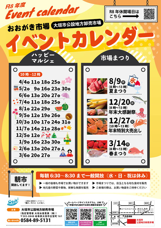 大垣市公設地方卸売市場では、市場を開放し、安心・安全な食材等を安価に提供することにより、市場機能と役割への理解を深めていただくとともに、市場の活性化を図るため、「ハッピーマルシェ」を開催しています。 卸売市場に、ぜひお越しください。 |