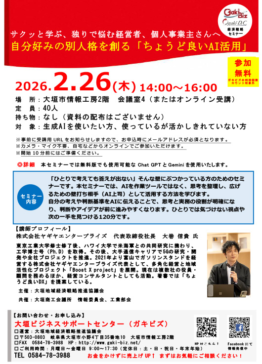 「ひとりで考えても答えが出ない」そんな壁にぶつかっている方のためのセミナーです。 本セミナーでは、AIを作業ツールではなく、思考を整理し、広げるための壁打ち相手(AI上司)として活用する方法を学びます。 自分の考えや判断基準をAIに伝えることで、思考と実務の役割が明確になり、判断やアイデアが前に進みやすくなります。 ひとりでは気づけない視点や次の一手を見つける120分です。 とき/ 2026年2月26日(木)14時00分〜16時00分 ところ/ 大垣市情報工房2階 会議室4 (オンライン聴講可) 内容/ サクッと学ぶ、独りで悩む経営者、個人事業主さんへ 自分好みの別人格を創る「ちょうど良いAI活用」 講師/ 株式会社ヤギヤエンタープライズ 代表取締役社長 大巻 信貴 氏 受講料/ 無料(ガキビズの相談回数のカウント対象外です) 来場定員/ 40名 申込方法/ インターネットのフォームよりお申し込みください。 主催/ 大垣地域経済戦略推進協議会 共催/ 大垣商工会議所 情報委員会、工業部会 ---------------------------------------------- ※お申込みなど、詳しくはホームページでご確認ください。 https://www.gaki-biz.net/260226aiseminar/ ---------------------------------------------- |