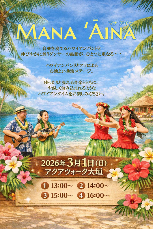 観覧無料! フラ&タヒチアンステージを開催! 音楽を奏でるハワイアンバンドと、伸びやかに舞うダンサーの鼓動がひとつに重なる・・ ハワイアンバンドとフラによる心地よい共演ステージ。 ゆったりと流れる音楽とともに、やさしく包み込まれるようなハワイアンタイムをお楽しみください。 ---------------------------------------------- ※詳しくは、ホームページでご確認ください。 https://walk-uny.com/aqua-walk/event/entry-36297.html ---------------------------------------------- |
