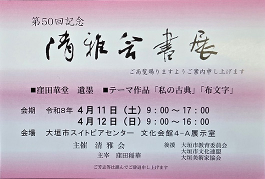 第50回記念清雅会書展を開催いたします。 私たち清雅会は、昭和39年に故 窪田華堂氏によって設立された、歴史ある書道愛好者の会で、現在窪田稲華先生を会長として、古典の勉強、社中展や公募展の作品作りなど数多くの活動を通して、日本の伝統文化を守り、地域への文化の発信を担って行きたいと、日々取りくんでおります。 清雅会書展は、様々な書体や大きさの書作品だけでなく、毎年趣向を凝らした課題作品に挑戦して会場を訪れる皆様を楽しませています。今年の課題作品テーマは「私の古典」「布文字」です。 臨書とは書道において長い年月の間廃れずその価値を多くの人に認められた古典作品を手本として書く方法です。古典の筆づかいや息づかい、書の基礎と美しさを学んだ過程そのものを感じて頂ければと思います。 布文字は、文字を紙と墨だけでなく、布の質感や色によって表現しました。素材の変化がもたらす書の新たな表情をご覧下さい。 一筆一筆に込めた思いと、表現の違いをお楽しみいただけましたら幸いです。皆様お誘い合わせのうえ、ぜひお越し下さい。 ---------------------------------------------- ※詳しくは、ホームページでご確認ください。 https://kagayaki.nisimino.com/docs/2026022500012/ ---------------------------------------------- |