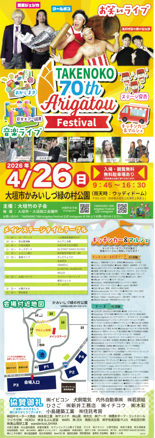 入場・観覧無料!無料駐車場あり! ◆お笑いライブ ・真空ジェシカ ・クールポコ ・スパイシーガーリック ◆音楽ライブ ・きしだりょうか ・GRANOLA ・DJ MOTIVE/deadbundy ・MILLEA ◆ステージ発表 ・和太鼓演奏 ・子供合唱団 ・キッズダンス ・よさこい踊り ◆お菓子まき ◆キッチンカー&マルシェ ◆巨大エアー遊具 |