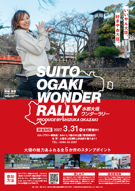 スタンプポイントを巡り、異なる色のスタンプを重ねて押して、カラフルなイラストを完成させよう! プロのバイクレーサーであり、「奥の細道むすびの地 大垣」交流大使及び地域活性化起業人として本市で活動している岡崎静夏さんが監修した重ね押しスタンプラリー「水都大垣ワンダーラリー」を市内一円で開催します。 ◆参加方法 スタンプラリー用紙があれば、どなたでもご参加いただけます。用紙はチラシをダウンロードし、A3用紙(両面短辺とじ)で印刷していただくか、スタンプポイント(全5か所)と市内の各公共施設等で入手可能です。 ◆スタンプポイント(全5か所) 1.大垣市かみいしづ緑の村公園(管理事務所) 2.金生山化石館(入口付近) 3.大垣市奥の細道むすびの地記念館(芭蕉庵) 4.墨俣一夜城(入口付近) 5.イオンモール大垣(スターバックス前) ◆達成者記念品 5つすべてのスタンプを集めて完成させたイラストを、かみいしづ緑の村公園(管理事務所)で提示すると、「オリジナルフォトフレームづくり」を無料体験できます。 ---------------------------------------------- ※詳しくは、ホームページでご確認ください。 https://www.city.ogaki.lg.jp/0000069625.html ---------------------------------------------- |