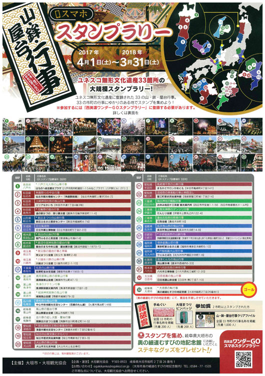 ≪ユネスコ無形文化遺産33箇所の大規模スタンプラリー!≫ ユネスコ無形文化遺産に登録された33の山・鉾・屋台行事。 33の市町の行事にゆかりのある地でスタンプを集めよう! ◆1.『八戸三社大祭の山車行事』 (はちのへ総合観光プラザ) ◆2.『角館祭りのやま行事』 (仙北市観光情報センター「角館駅前蔵」) ◆3.『土崎神明社祭の曳山行事』 (エリアなかいち) ◆4.『花輪祭の屋台行事』 (道の駅 かづの 祭り展示館) ◆5.『新庄まつりの山車行事』 (新庄ふるさと歴史センター) ◆6.『日立風流物』 (日立市郷土博物館) ◆7.『烏山の山あげ行事』 (龍門ふるさと民芸館) ◆8.『鹿沼今宮神社祭の屋台行事』 (屋台のまち中央公園 屋台展示館) ◆9.『秩父祭の屋台行事と神楽』 (秩父まつり会館) ◆10.『川越氷川祭の山車行事』 (川越まつり会館) ◆11.『佐原の山車行事』 (佐原町並み交流館) ◆12.『高岡御車山祭の御車山行事』 (高岡御車山会館) ◆13.『魚津のタテモン行事』 (魚津駅前観光案内所) ◆14.『城端神明宮祭の曳山行事』 (城端曳山会館) ◆15.『青伯祭の曳山行事』 (中心市街地観光交流センター(花嫁のれん館)) ◆16.『高山祭の屋台行事』 (高山祭屋台会館) ◆17.『古川祭の起し太鼓・屋台行事』 (飛騨古川まつり会館) ◆18.『尾張津島天王祭の車楽舟行事』 (津島市観光交流センター) ◆19.『知立の山車文楽とからくり』 (知立市歴史民俗資料館) ◆20.『犬山祭の車山行事』 (犬山市文化史料館) ◆21.『亀崎潮干祭の山車行事』 (まちかどサロンかめとも) ◆22.『須成祭の車楽船行事と神葭流し』 (蟹江町歴史民俗資料館) ◆23.『鳥出神社の鯨船行事』 (お休み処四十三茶屋 観光案内所) ◆24.『上野天神祭のダンジリ行事』 (だんじり会館) ◆25.『桑名石取祭の祭車行事』 (石取会館) ◆26.『長浜曳山祭の曳山行事』 (長浜市曳山博物館) ◆27.『京都祇園祭の山鉾行事』 (京都市無形文化遺産展示室) ◆28.『博多祇園山笠行事』 (博多町家ふるさと館) ◆29.『戸畑祇園大山笠行事』 (ウェルとばた) ◆30.『唐津くんちの曳山行事』 (曳山展示場) ◆31.『八代妙見祭の神幸行事』 (八代市立博物館) ◆32.『日田祇園の曳山行事』 (日田祇園山鉾会館) ◆33.『大垣祭の車山行事』 (奥の細道むすびの地記念館) ************************************************* ◇踏破賞・・・手ぬぐい 全国33市町の 祭り名称を掲載(先着200人) ◇踏破賞・・・大垣まつりピンバッジ (先着200人) ◇参加賞・・・山・鉾・屋台クリアファイル 全国33市町の祭り名称を掲載(先着1,000名) ************************************************* 詳しくはホームページをご覧ください。 |