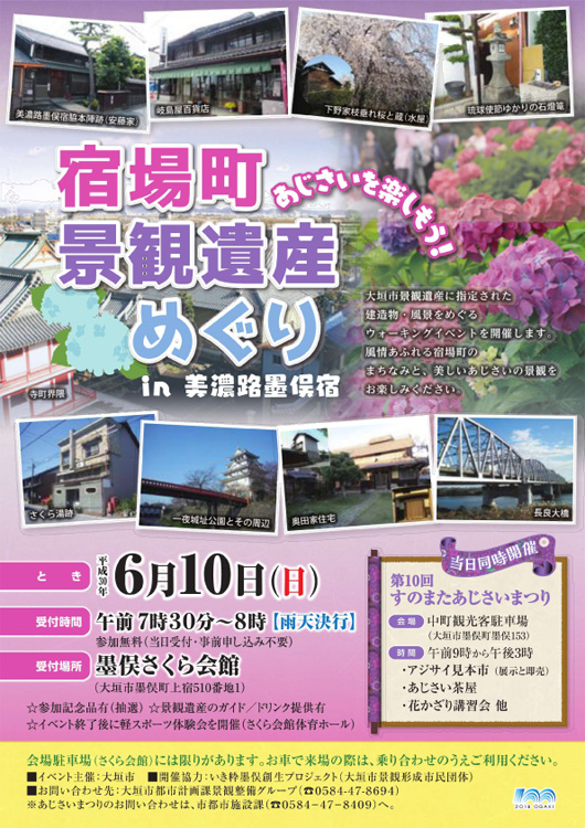 大垣市景観遺産に指定された建造物・風景をめぐるウォーキングイベントを開催します。風情あふれる宿場町のまちなみと、美しいあじさいの景観をお楽しみください ・参加記念品有(抽選) ・景観遺産のガイド/ドリンク提供有 ・イベント終了後に軽スポーツ体験会を開催(さくら会館体育ホール) 詳しくはホームページをご覧ください。 |