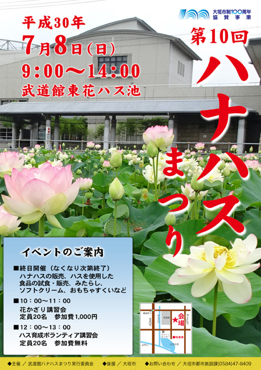 真夏の早朝、水辺に咲く可憐なハスの花をお楽しみください ◆終日開催(※無くなり次第終了) ・花ハスの販売 ・ハスを使用した食品の試食、販売 ・ソフトクリーム、おもちゃすくいなど ◆10時00分〜11時00分 花かざり講習会(定員20人、参加費1,000円) 季節にあった寄せ植えを制作します! ◆12時00分〜13時00分 ハス育成ボランティア講習会(定員20人、参加費無料) ※育成ボランティアとは、当日お渡しする花苗や種をご家庭で育てていただき、そのうち1本は公園緑地へ戻して植栽し、残りはご家庭で楽しんでいただくものです。 詳しくはホームページをご覧ください。 |