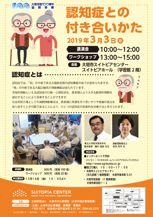 ◆講演会 10時00分〜12時00分(開場9時30分) ◆ワークショップ 13時00分〜15時00分(開場12時30分) <参加費> 講演会・ワークショップとも 500円 <対象・定員> 認知症に関心がある人なら誰でも気軽に参加できます。 定員:講演会 100名 ワークショップ 20名 ========================================== 認知症とは・・・ 認知症では、「知」の中枢である大脳新皮質の認知機能の低下が認められますが、「情」の中枢である大脳辺縁系の情動機能は保たれています。 苦悩的情動といえる認知症の行動・心理症状も、患者様により大きな歓喜的情動を創出することにより改善することができます。 社会的処方箋としての演劇情動療法は、患者様に笑顔を作り思いやりや感謝の表出を取り戻すことが可能であることにより、ひとつの認知症の効果的な治療方法と考えられます。 ========================================== 詳しくはホームページをご覧ください。 |