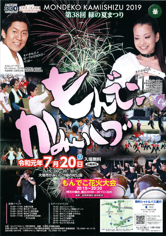 【会場イベント】 ◆15時00分〜17時00分 水遊び広場 ◆15時00分〜17時00分 軽スポーツ大会 ◆15時00分〜20時30分 もんでこ楽市楽座 ◆15時30分〜20時00分 緑の村工作教室 ◆16時00分〜17時00分 上石津中学校生徒会 子ども広場 【ステージイベント】 ◆15時30分 よさこいソーラン ◆16時30分 ほうさわバレエ教室ステージ ◆17時00分 オープニングセレモニー ◆17時15分 地元バンド演奏 かかのも ◆18時00分 もんでこ太鼓演奏 ◆18時45分 もんでこ盆踊り ◆19時30分 ものまねステージ ◆20時15分 もんでこ花火大会 詳しくはホームページをご覧ください。 |