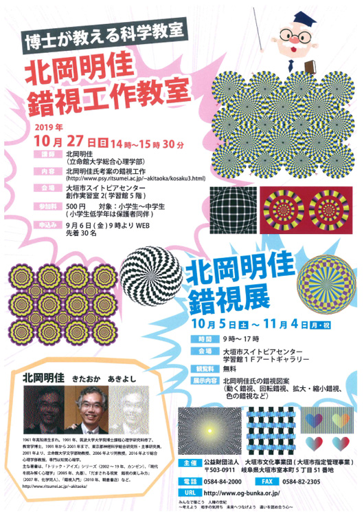 動く?大きさや色が変わる?不思議な錯視アートの世界! ========================================== 静止しているのに、なぜか不思議に動いているように見える図案などを多数考案した錯視研究の第一人者である北岡明佳教授(立命館大学)の作品を展示します ========================================== ◆入場料:無料 詳しくはホームページをご覧ください。 |