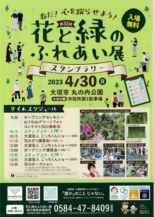 ---------------------------------- 【スタンプラリー】 四季の路や中心市街地を巡る(参加した人で募金された人に、苗木の配布あり) 【講習会】 花かざり、ガーデニング(要事前申込) 【アトラクション】 「おうちdeグリーンフォトコンテスト」入賞者表彰式とパネル展示 【販売】 キッチンカー、野菜・花・花卉・園芸資材など ---------------------------------- ≪タイムスケジュール≫ 9時30分 オープニングセレモニー おうちdeグリーンフォトコンテスト2022表彰式 10時15分 スタンプラリー1陣 10時15分 大道芸人 ごっちくんショー(1回目) 11時15分 花かざり講習会(18名) ※事前予約制 12時00分 大道芸人 ごっちくんショー(2回目) 13時00分 ガーデニング講習会(18名) ※事前予約制 13時30分 スタンプラリー2陣 13時45分 大道芸人 ごっちくんショー(3回目) 14時30分 花のオークション 詳しくはホームページをご覧ください。 |