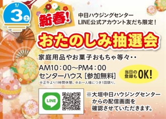 | 新年あけましておめでとうございます 今年も大垣中日ハウジングセンターをよろしくお願いします! 中日ハウジングセンターLINE公式アカウント友だち限定! おもちゃやお菓子、家庭用品などなど・・が当たる! ※参加無料 ※大垣中日ハウジングセンターからの配信画面を確認させていただきます ※お一人様1回限り《当日の登録もOK!》 ※景品がなくなり次第終了 ---------------------------------------------- ※詳しくはホームページでご確認ください。 https://www.chunichi-hc.ne.jp/oogaki/event/view/#link5978 ---------------------------------------------- |