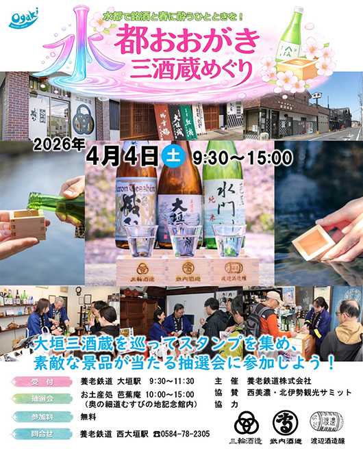 | 好評をいただいた昨年に続き今回で2回目、市内の三酒蔵や湧水スポットなどを歩いて巡るハイキングイベントです。 受付で配布されるコースマップの順に巡って集めた三酒蔵のスタンプを持って、ゴールの「お土産処 芭蕉庵(奥の細道むすびの地記念館内)」で抽選に参加すると素敵な景品が当たるかも… 豊かな湧水に恵まれた水都(すいと)大垣には歴史ある3つの酒蔵があり、伝統の技と銘水が醸し出す大垣ならではの”銘酒”の数々が生まれます。 イベントコースの途中には湧水スポットが多数あり、大垣の銘酒と銘水を楽しみながらのハイキングとなります。 また、当日は市内各所で様々なイベントが同時開催されます。 大垣のまち歩きを楽しみながら、ゆっくり三酒蔵をめぐってみませんか? 【参加方法・詳細】 ?養老鉄道 大垣駅で受付 ※受付時間:09:30-11:30 コースマップ(兼スタンプラリー台紙)を受け取る ?市内三酒蔵 渡辺酒造醸→武内酒造→三輪酒造の順に巡り、台紙にスタンプを押す 途中、大垣の湧水スポットも楽しめます ※各酒蔵ではお酒の試飲のおもてなしがあります ?三酒蔵全てのスタンプを集めた台紙を持って、お土産処 芭蕉庵(奥の細道むすびの地記念館内)で抽選に参加 芭蕉庵で素敵な景品をご用意しております ※抽選時間:10:00-15:00 ---------------------------------------------- ※詳しくは、ホームページでご確認ください。 https://www.yororailway.co.jp/news/3135/ ---------------------------------------------- |