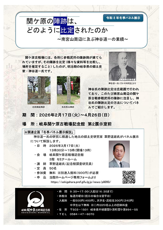 | 岐阜関ケ原古戦場記念館では、関ケ原合戦参戦武将の布陣地を定める基礎を作ったといわれる、明治期の岐阜県の郷土史家 神谷道一氏の取組みに関するパネル展示を開催します。参戦武将の中から南宮山周辺に布陣した池田輝政・浅野幸長・毛利秀元の陣跡を取り上げ、これらの陣跡の場所がどのような方法で推定されたのかについて、紹介します。 ◆関連企画「冬季パネル展示解説」 日時/3月17日(火)13時30分〜15時 (開場13時) 会場/記念館3階セミナールーム 講師/草野道雄氏(岐阜関ケ原古戦場記念館 調査研究員) 内容/神谷道一氏の研究に精通した地元の郷土史研究家 草野道雄氏がパネル展示について解説します 定員/50名(事前申込・先着順) 参加費/無料 ※別途入館料が必要です 申込方法/記念館HP【専用フォーム】から申し込みください ---------------------------------------------- ※詳しくは、ホームページでご確認ください。 https://sekigahara.pref.gifu.lg.jp/news/p8093/ ---------------------------------------------- |