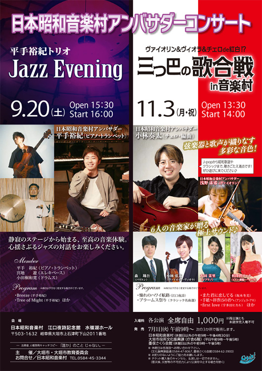 | 日本昭和音楽村の魅力を演奏活動を通じて発信し、たくさんのお客様に来ていただけるようご協力いただいている、日本昭和音楽村アンバサダーの皆さんによるコンサートを開催します。 ヴァイオリン&ヴィオラ&チェロde紅白!? 三つ巴の歌合戦in音楽村 【出演】 小林奏太(日本昭和音楽村アンバサダー)/チェロ 浅野未希(日本昭和音楽村アンバサダー)/ヴァイオリン 森翔吾/バリトン 小林弦太/ヴィオラ 大田茉里/ソプラノ 松澤碧ティナ/ピアノ・鍵盤ハーモニカ 【プログラム】 憧れのハワイ航路(江口夜詩) ブラームス祭り(クラシック名曲選) また君に恋してる(坂本冬美) 手紙〜拝啓15の君へ(アンジェラ・アキ) ほか ---------------------------------------------- ※詳しくは、ホームページでご確認ください。 https://www.city.ogaki.lg.jp/ongaku/0000037143.html#20250920 ---------------------------------------------- |