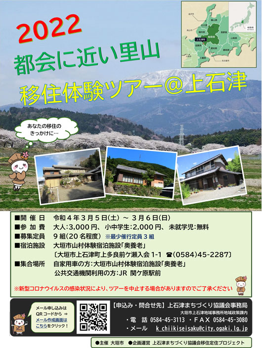| 大垣市上石津地域は、岐阜県の最西南端に位置し、豊富な歴史資源に恵まれた三重県と滋賀県に隣接した大垣市のグリーンゾーンです。 このツアーは、上石津地域への移住定住を促進するため、移住を検討する皆様に、大垣市上石津町の自然体験や地域に暮らす人々との交流を通して、移住のきっかけの場としていただくための移住体験ツアーです。 なお、当ツアーの開催にあたっては、新型コロナ感染症対策の徹底を図るとともに、市外からの参加者を優先して募集させていただきます。 ◇宿泊場所:〒503-1623岐阜県大垣市上石津町上多良前ケ瀬入会1番地1 大垣市かみいしづ緑の村公園 山村体験宿泊施設「奥養老」 ◇参加定員:9組20名程度 ◇対象:移住を検討している方、里山暮らしを体験したい方 ◇内容:空家見学、先輩移住者や地域住民との交流、自然体験など ◇参加費用:大人3,000円、小中学生2,000円(未就学児は無料) ※食事代・宿泊費を含む ◇申込方法:電話、Eメール(K_chiikiseisaku@city.ogaki.lg.jp)、ファックスでお申し込みください ◇申込締切:令和4年2月21日(月)まで --------------------------------- 詳細につきましてはホームページをご覧ください。 |