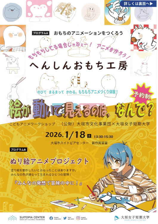 | 漫画やイラスト、アニメーションなど視覚表現はさまざまな場所で活用され、幅広い分野で必要とされています。今回は、児童を対象にアニメーションの制作を通じて創造性を育むワークショップを行います。 講師は、大垣女子短期大学デザイン美術学科准教授黒田皇先生と、メディアデザインコースの学生さんたち。アニメーションの基本をわかりやすく体験できる2つのプログラムを考えてくれました。 動いたらいいのに…が叶う楽しい時間を過ごしてみませんか? ---------------------------------------------- ※詳しくはホームページでご確認ください。 https://www2.og-bunka.or.jp/event/data_1442.html ---------------------------------------------- |