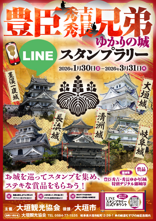 | 5か所のお城をめぐってスタンプを集めるお城LINEスタンプラリーを実施します。 規定数のスタンプを集めた方には、賞品をプレゼントします。 <参加手順> (1)まずはLINE公式アカウントと友だちになろう! (2)お城を巡って、QRを読み取りデジタル御城印を集めよう! (3)5城のデジタル御城印を集めたら、踏破賞が自動配信! <賞品> 【踏破賞】豊臣秀吉・秀長ゆかり5城 特別デジタル御城印 ---------------------------------------------- ※詳しくは、ホームページでご確認ください。 https://www.ogakikanko.jp/event/toyotomikyodaistamp/ ---------------------------------------------- |