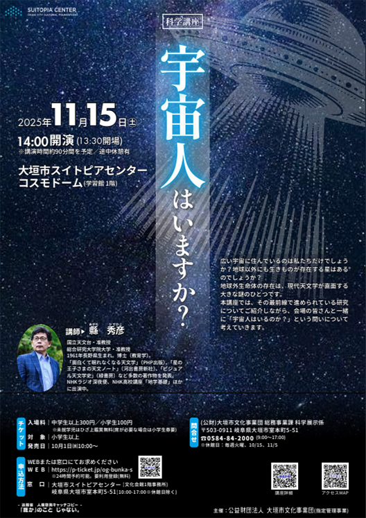 | ◆宇宙人の謎に迫る!現代天文学の最前線 広い宇宙に住んでいるのは私たちだけでしょうか? 地球以外にも生きものが存在する星はあるのでしょうか? 地球外生命体の存在は、現代天文学が直面する大きな謎のひとつです。 本講座では、その最前線で進められている研究についてご紹介しながら、会場の皆さんと一緒に「宇宙人はいるのか?」という問いについて考えていきます。 ◆講師 縣 秀彦 (国立天文台・准教授/総合研究大学院大学・准教授) ◆入場料 中学生以上 300円 小学生 100円 未就学児はひざ上鑑賞無料 ◆対象 小学生以上 ◆注意事項 ・当日、コスモドームの定期上映は中止となります。 ・申込後のキャンセル(当日清算)は、必ず事前にお電話でご連絡ください。 ・席が必要な場合は未就学児でも小学生チケットの購入が必要です。 ◆チケット購入 窓口発売日:2025年10月1日(水)10:00〜 Web発売日:2025年10月1日(水)10:00〜 ---------------------------------------------- ※お申込みなど詳しくは、ホームページでご確認ください。 https://www2.og-bunka.or.jp/event/data_1426.html ---------------------------------------------- |