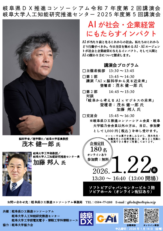 | 岐阜県DX推進コンソーシアム令和7年度第2回講演会「AI×脳科学から見る近未来」「岐阜から考えるAI×ビジネスの未来」 |