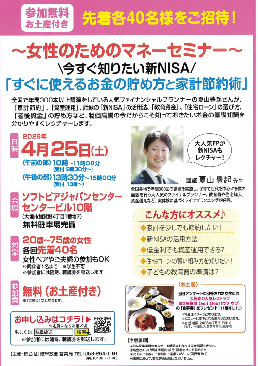 | 全国で年間300本以上講演をしている人気ファイナンシャルプランナーの夏山豊起さんが、「家計節約」、「資産運用」、話題の「新NISA」の活用法、「教育資金」、「住宅ローン」の選び方、「老後資金」の貯め方など、物価高騰の今だからこそ知っておきたいお金の基礎知識を分かりやすくレクチャーします。 セミナーの司会は、ぎふチャン ラジオパーソナリティの吉田 早苗。 参加費は無料です。さらにお土産として、大垣市の人気レストラン旬菜居食屋 Oeuf Oeuf (ウフ ウフ)の「食事券」をプレゼント!! ---------------------------------------------- ※詳しくは、ホームページでご確認ください。 https://www.zf-web.com/event/moneyseminar2604.html ---------------------------------------------- |