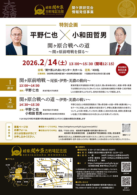 | 岐阜関ケ原古戦場記念館(以下「記念館」という。)では、令和5年10月に発足した関ケ原研究会の情報発信事業として、戦国時代や江戸時代を専門とし、徳川家の歴史や歴史書に関する研究を行う東海学園大学准教授の平野仁也(ひらのじんや)氏の講演会と平野仁也氏、小和田哲男(おわだてつお)記念館館長との対談を一度に味わえる特別企画を開催します。 参加を希望される方は、応募フォームまたは往復はがきにてお申込みください。 皆様のご参加をお待ちしています。 ◆応募フォーム https://www.pref.gifu.lg.jp/ques/questionnaire.php?openid=1184 【講演会】 講師/平野 仁也 氏(東海学園大学准教授) 時間/13時〜14時 演題/「関ヶ原前哨戦〜尾張・伊勢・美濃の動向〜」 内容/関ヶ原本戦の前に、尾張・伊勢・美濃では両勢力がどのように争っていたのか、当該地域の諸領主や徳川家康、石田三成が発給した文書を取り上げながら、各地の攻防戦について解説します。 【対談】 対談者/平野 仁也 氏(東海学園大学准教授)・小和田 哲男(岐阜関ケ原古戦場記念館館長) 時間/14時30分〜15時30分 テーマ/「関ヶ原合戦への道〜伊勢・美濃の戦い〜」 内容/講演内容もふまえ、伊勢と美濃の東軍・西軍の両勢力の様子をより深く考察していきます。徳川家康と石田三成の対応の差や東軍と西軍の相違点を通じて、何が勝敗の分かれ目となったのかを探っていきます。 ---------------------------------------------- ※お申込みなど、詳しくはホームページでご確認ください。 https://sekigahara.pref.gifu.lg.jp/news/p8021/ ---------------------------------------------- |