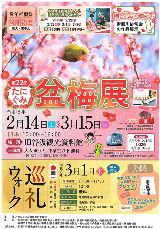 | 丹精込めて育て上げられた美しい梅の香りに包まれて 今年で22回目となる「たにぐみ盆梅展」 丹精込められて育てあげられた、美しい梅がご覧いただけます。 期間中、各種イベントが開催されます。詳しくはチラシでご確認ください。 料金/大人400円、中学生以下無料(10人以上の団体は100円引き) ---------------------------------------------- ※詳しくはホームページでご確認ください。 https://www.kankou-gifu.jp/event/detail_6449.html ---------------------------------------------- |