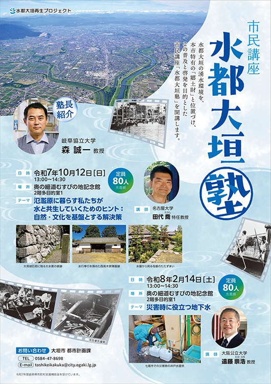 | 水都大垣の湧水環境を、大垣市特有の「郷土財」と位置づけ、この普及と啓発を目的とした市民講座です。 開催日/[講座1]2025年10月12日(日) [講座2]2026年2月14日(土) とき/13:00〜14:30 ところ/奥の細道むすび地記念館 2階多目的室1 定員/80名(先着順) [講座1]氾濫原に暮らす私たちが水と共生していくためのヒント:自然・文化を基盤とする解決策 講師/名古屋大学 田代 喬(たかし) 特任教授 [講座2]災害時に役立つ地下水 講師/大阪公立大学 遠藤 崇浩 教授 ---------------------------------------------- ※詳しくは、ホームページでご確認ください。 https://www.city.ogaki.lg.jp/0000068359.html ---------------------------------------------- |