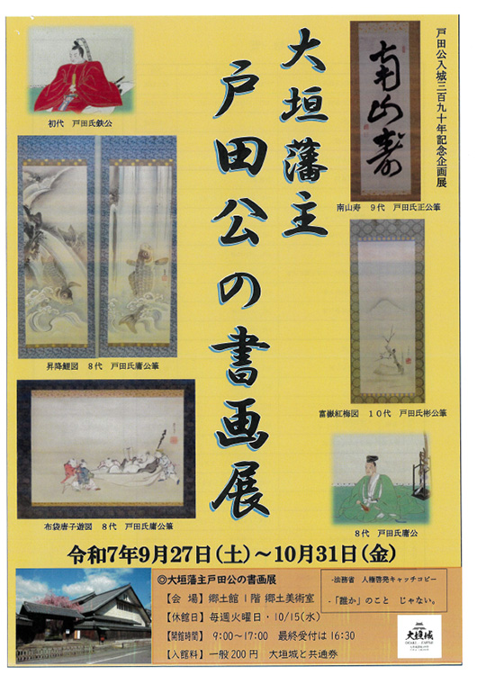 本年は、大垣藩初代藩主 戸田氏鉄(うじかね)公が大垣城へ入部してから390年にあたります。今回の展示では、八代藩主 戸田氏庸公の作品を中心に、戸田公の作品やゆかりの品を紹介します。 とき/9:00〜17:00 最終受付は16:30 入館料/一般200円(大垣城と共通券) 休館日/毎週火曜日・10月15日(水) |