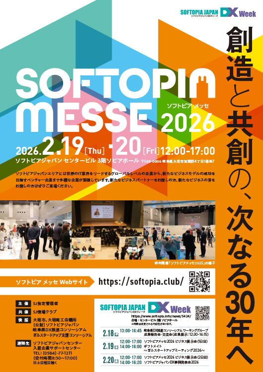 | 2026年2月18日(水)から20日(金)にかけてソフトピアジャパンでは、「SOFTOPIA JAPAN DX Week」が開催されます。 ◆岐阜県DX推進コンソーシアム ワーキンググループ成果報告会 2月18日(水) 13:30〜16:30 https://gifudx.softopia.or.jp/20260218_seikahoukokukai/ ◆ソフトピアメッセ2026 ビジネス展示会 2月19日(木)・20日(金) 12:00〜17:00 https://softopia.club/ ◆ギフメイト 〜ぎふスタートアップミーティング2026〜 2月19日(木) 14:00〜16:00 https://www.gpc-gifu.or.jp/topics/2026010701/index.asp ◆ソフトピアジャパンDX事例発表会2026 2月20日(金) 14:00〜16:00 https://www.sjjojoclub.jp/happyokai2026 ---------------------------------------------- ※詳しくは、ホームページでご確認ください。 https://www.softopia.info/news/5424/ ---------------------------------------------- |