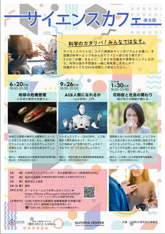 | <科学のカタリバ!みんなではなそ。> サイエンスカフェは、カタい講演会やシンポジウムとは違い、今話題の科学トピックをみんなでワイワイ語り合う場です! 3つの「お題」をもとに、さまざまな意見や感想をシェアしながら、科学の謎や不思議を一緒に再発見しませんか? 知識がなくてもOK‼お気軽にご参加ください。 ◆参加費 無料 ◆定員 各回10名程度 ※応募多数の場合は抽選となる場合があります。 ◆対象 高校生以上推奨 ◆日時・内容 【第1回】地球の危機管理〜小天体の衝突を回避せよ〜 6月20日(金)18:30〜20:00 【第2回】AIは人間になれるか〜「心の哲学」入門〜 9月26日(金)18:30〜20:00 【第3回】花粉症の社会の関わり〜風が吹けば桶屋が儲かる〜 2026年1月30日(金)18:30〜20:00 ◆時間 18:30〜20:00(受付18:00) ◆申込開始 【第1回】5月16日(金)10:00〜 【第2回】8月22日(金)10:00〜 【第3回】12月12日(金)10:00〜 ◆注意事項 申込後のキャンセルは、必ず事前にお電話でご連絡ください。 ◆申込み 下記のホームページをご覧ください。 https://www2.og-bunka.or.jp/event/data_1411.html |